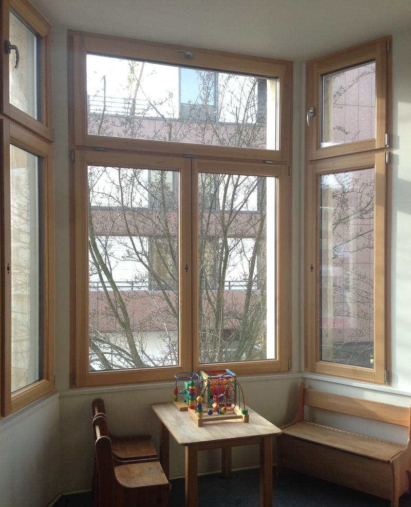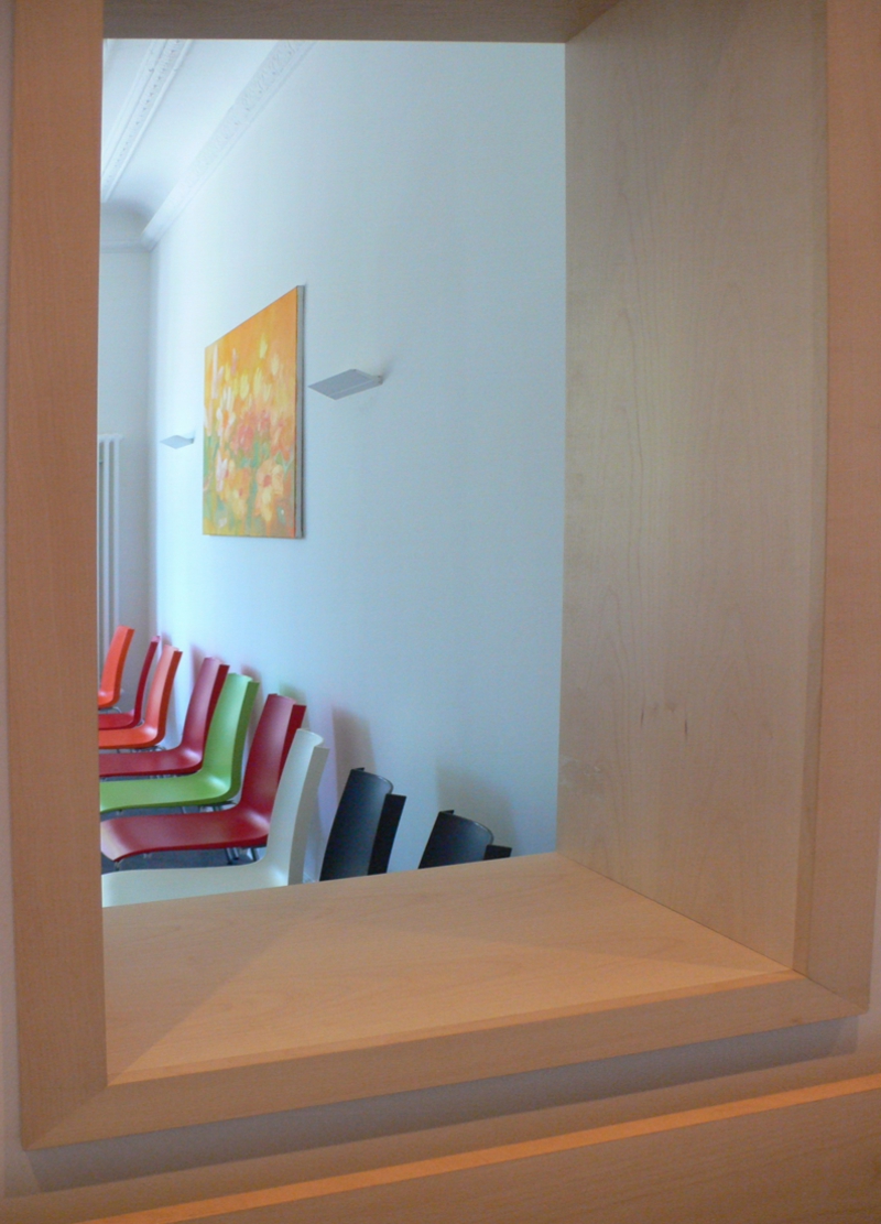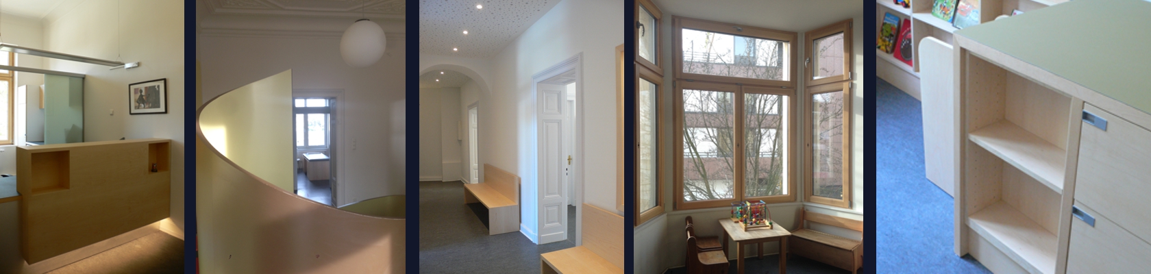Aufgabe: Das direkt im Zentrum von Benrath gelegene Bürgerhaus aus dem Anfang des 20sten Jahrhundert, war durch zahlreiche Renovierungen und Umbauten vollkommen entstellt. Für die alte Praxis waren verschiedene Eingriffe erfolgt, durch die die ursprüngliche klare Raumaufteilung verloren gegangen war, die abgehängten Decken taten ihr übriges. Ziel war es deshalb, die ursprüngliche Raumwirkung wieder herzustellen und durch Umstrukturierung der einzelnen Bereiche einen effizienteren Praxisbetrieb zu erreichen. |