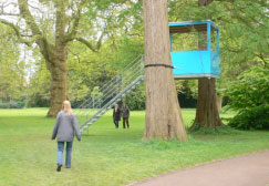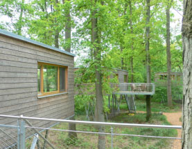 Bei den aufgestelzten Ferienhäusern in Bad Zwischenahn vom Kollegen Andreas Wenning ist nur die große Terrasse am Baum aufgehängt. Aber wegen den dünnen Stelzen schwingt das Haus trotzdem, so wie ein Baum bei Wind. Besonders beim auf und abgehen bekommt man Lust zu tanzen. Wir haben es sehr genossen.