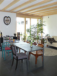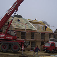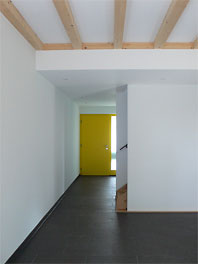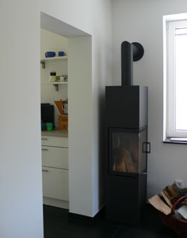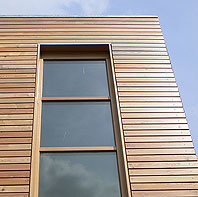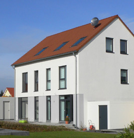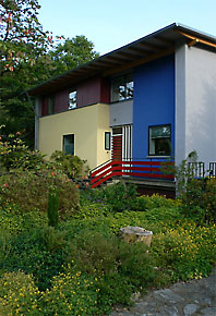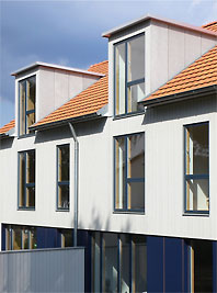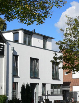 Wir haben einen Reihenhaustyp entwickelt, der flexibel auf unterschiedlichste Grundstücksituationen angewendet werden kann. In Haan-Gruiten konnten wir ein Doppelhaus in Holzrahmenbauweise verwirklichen. Die Holzelemente wurden in 3 Tagen montiert. Besondere Ausstattungsmerkmale sind die lasierte, sägerauhe Massivholzfassade, nach aussen zu öffnende Holz-Alu-Fenster und eine Fussbodenheizung. Das Haus ist als Niedrigenergiehaus konzipiert. Es wurde eine Lüftungsanlage mit Wärmerückgewinnung eingebaut. |