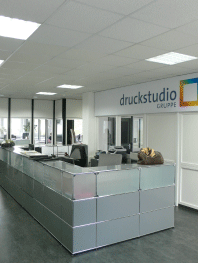 Dazu gewonnene, vorhandene Büroräume im 1, Obergeschoss wurden den Bedürfnissen des Druckstudios angepasst. Es ist ein attraktiver Kundenbetreuungsbereich mit Empfang und Teeküche entstanden, sowie weitere Büroräume mit Lagerflächen.