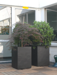 Der hässliche Fliesenbodenbelag wurde durch Holzfliesen abgedeckt. Kübel mit attraktiver Bepflanzung lockern den Patio auf.
