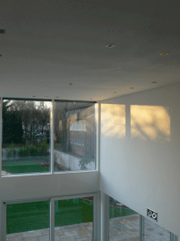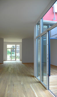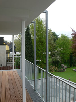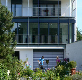 Am Ende einer Reihenhauszeile aus den 1980er Jahren wurde ein großzügiges EFH mit offener Galerie, Aufzug und Dachterrasse errichtet.