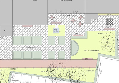 Die heruntergekommene, lange nicht gepflegte Außenanlage soll der neuen Nutzung des Vereins angepasst werden. Da die Kapelle weiterhin besteht und für die Anwohner ein Bezug zu ihrer ehemaligen Kirche gegeben sein soll, nimmt der Entwurf Rücksicht darauf.