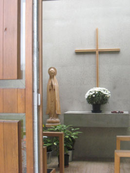 Kirchenbau von 1967 des Architekten Alfons Leitl Profanierung am 13.04.2010 Umbau durch den Verein Köln Ring zu Wohnungen für psychisch Kranke mit Begegnungscafe; Bürotrakt, Architekt A. Ortiz, Köln