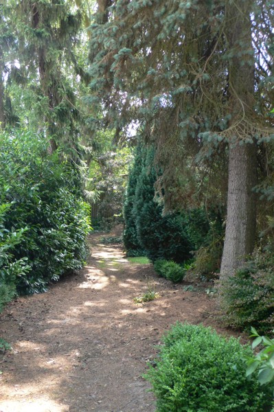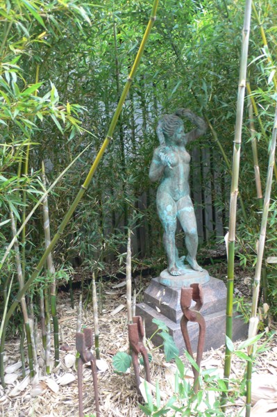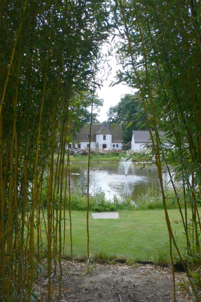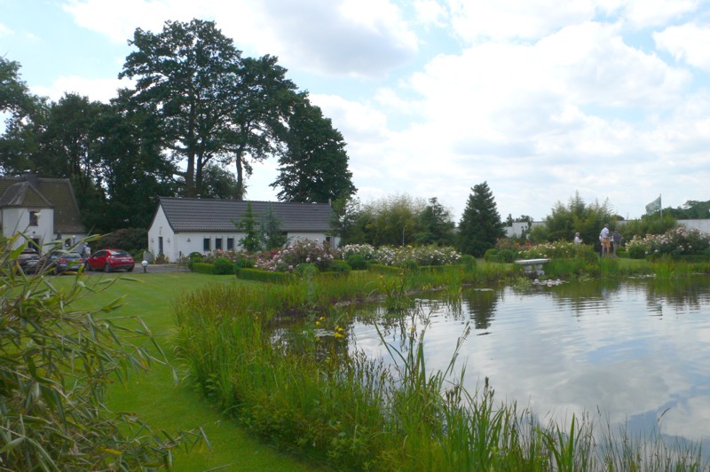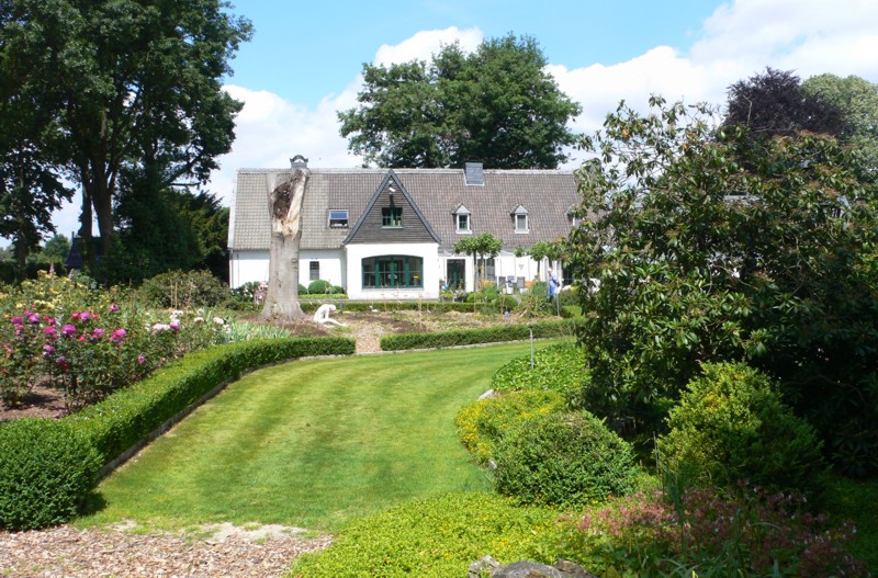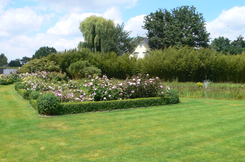 Heute zeigt sich ein Gartenparadies von seinen besten Seiten. Wo früher nur Rasenfläche war, blühen die Englischen Rosen des Züchters David Austin und verbreiten ihren herrlichen Duft. Buchshecken gliedern die Fläche und leiten den Besucher über Rasenwege zum Betrachten der Rosen. Die Zaunanlage zum Nachbarn wird vom Bambushain mit seinen Inseln verdeckt. Versteckte Skulpturen sind beim Durchlaufen zu entdecken. |
