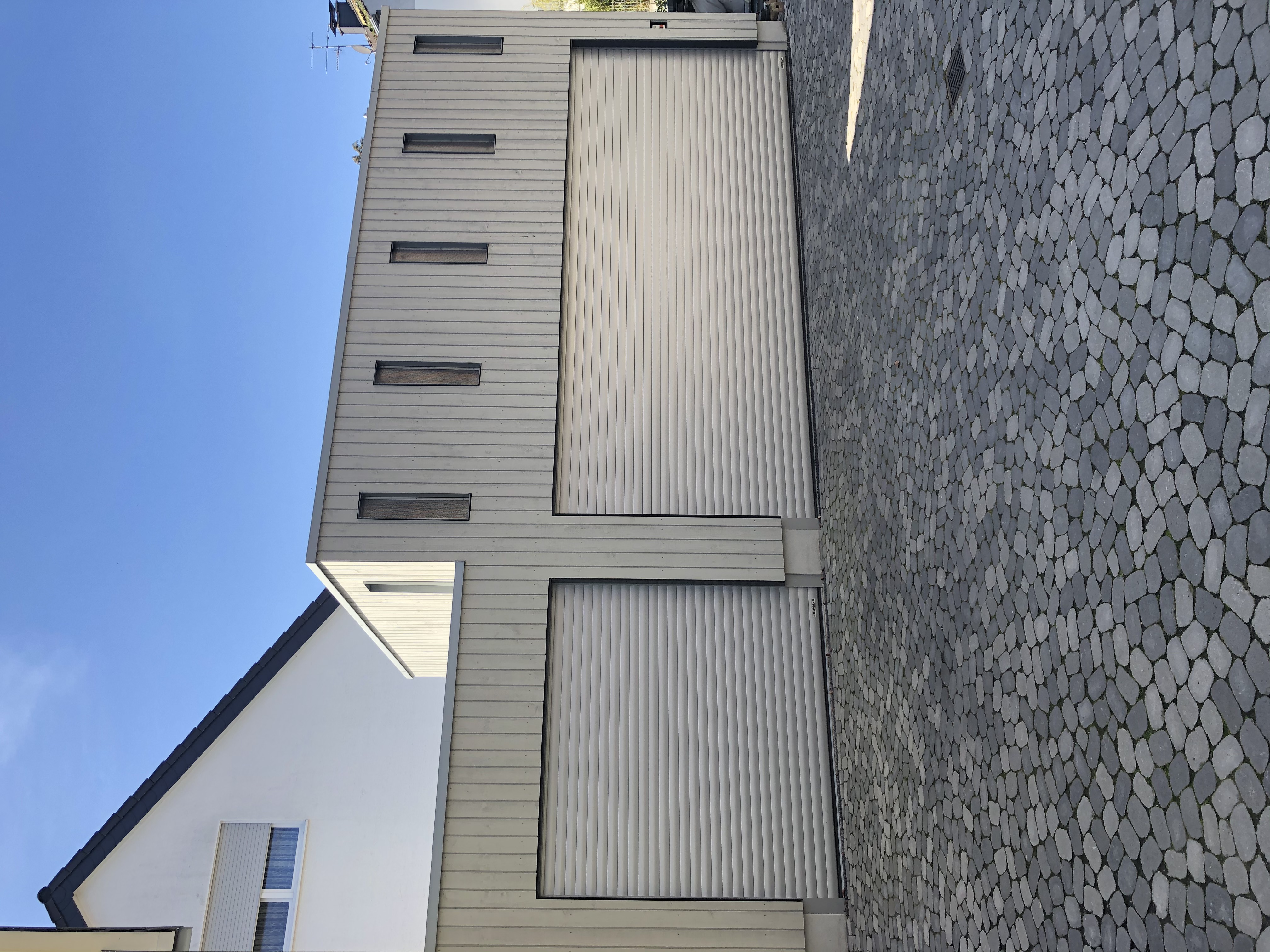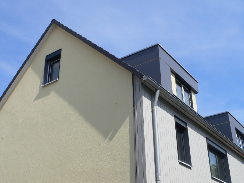 Grau lasierte Holzschalung aus kanadischen Lodgepole Pine, farbige Putzflächen und Hochdruck – Schichtpressstoffplatten (HPL) prägen die äußere Erscheinung.
