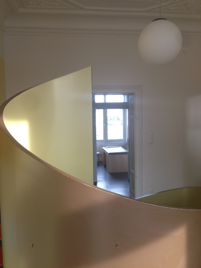 Mittelpunkt der Praxis ist das zentrale Erkerzimmer. Dort befindet sich Spiel- und Wartezonen für die Kinder und Begleitung, mit „Raumschnecke“, zum Verstecken.