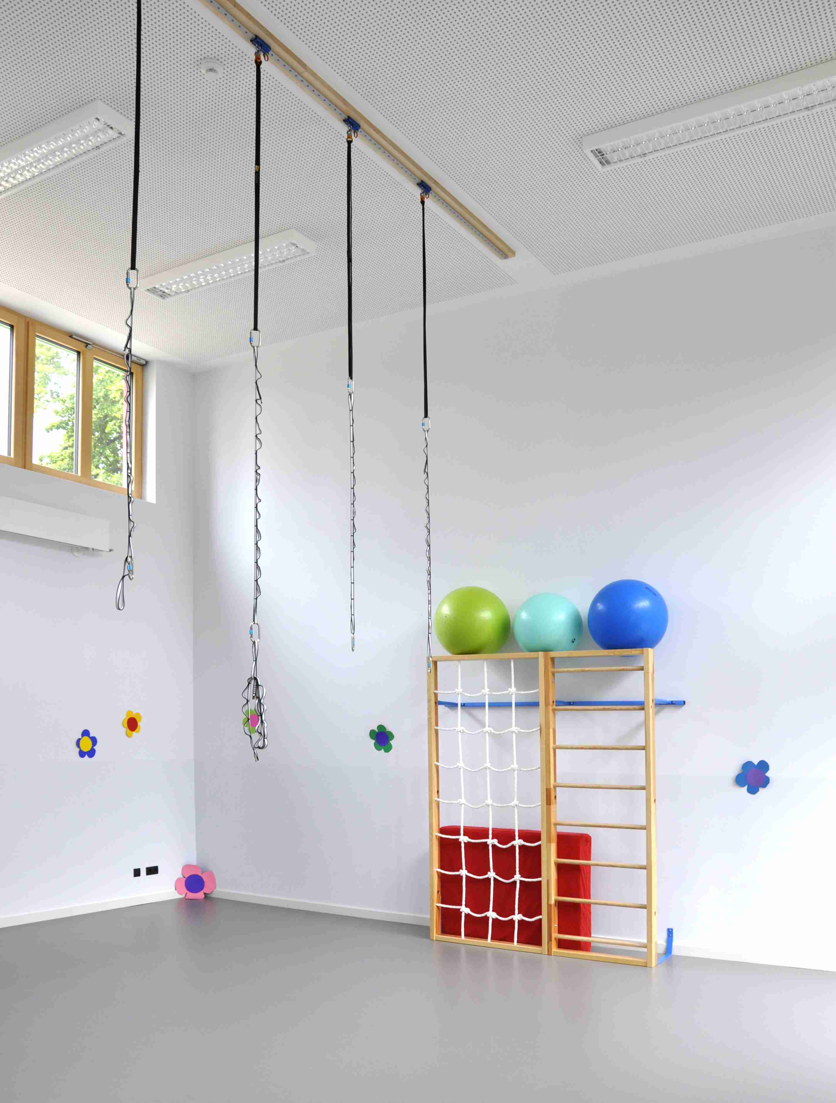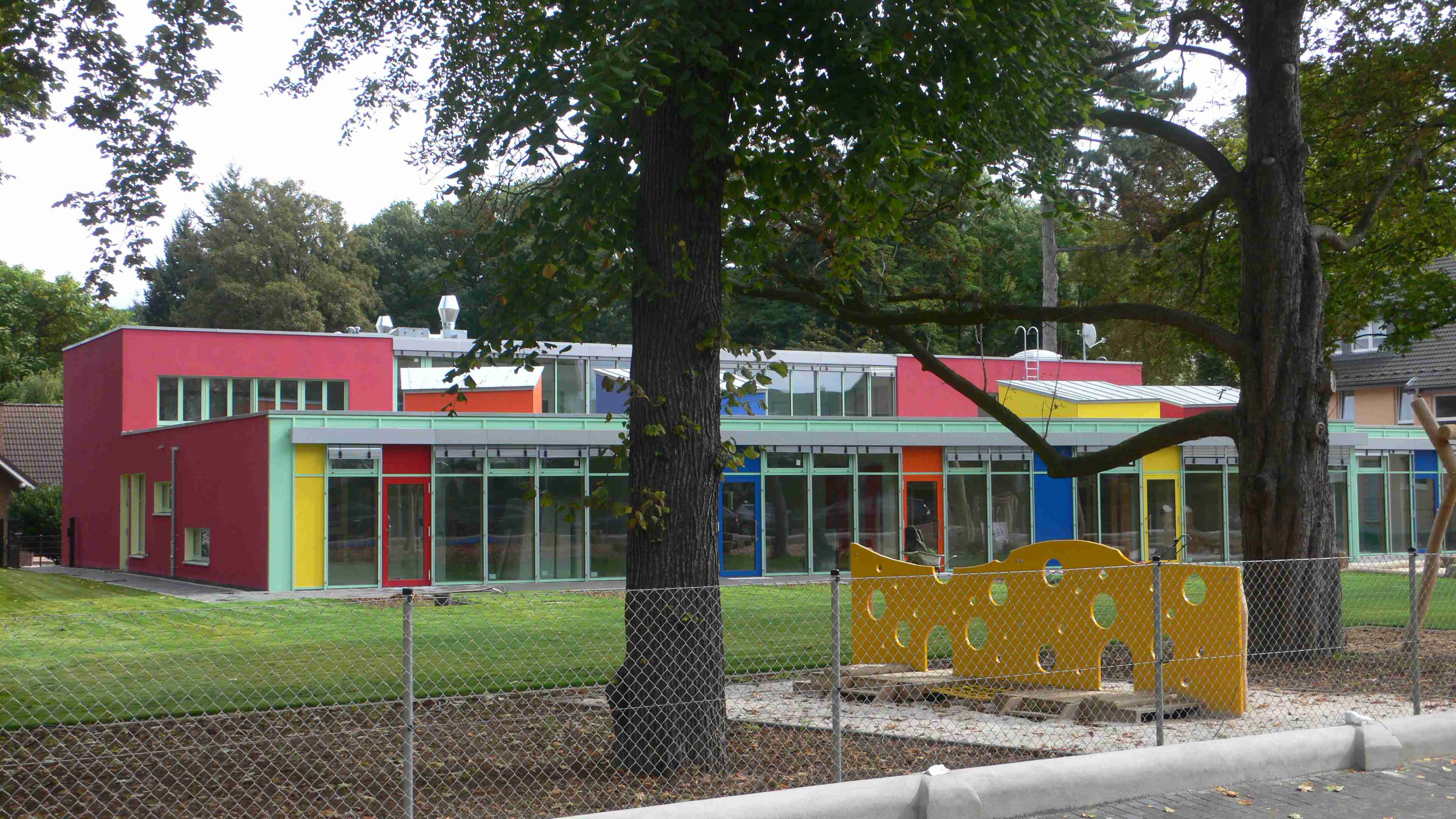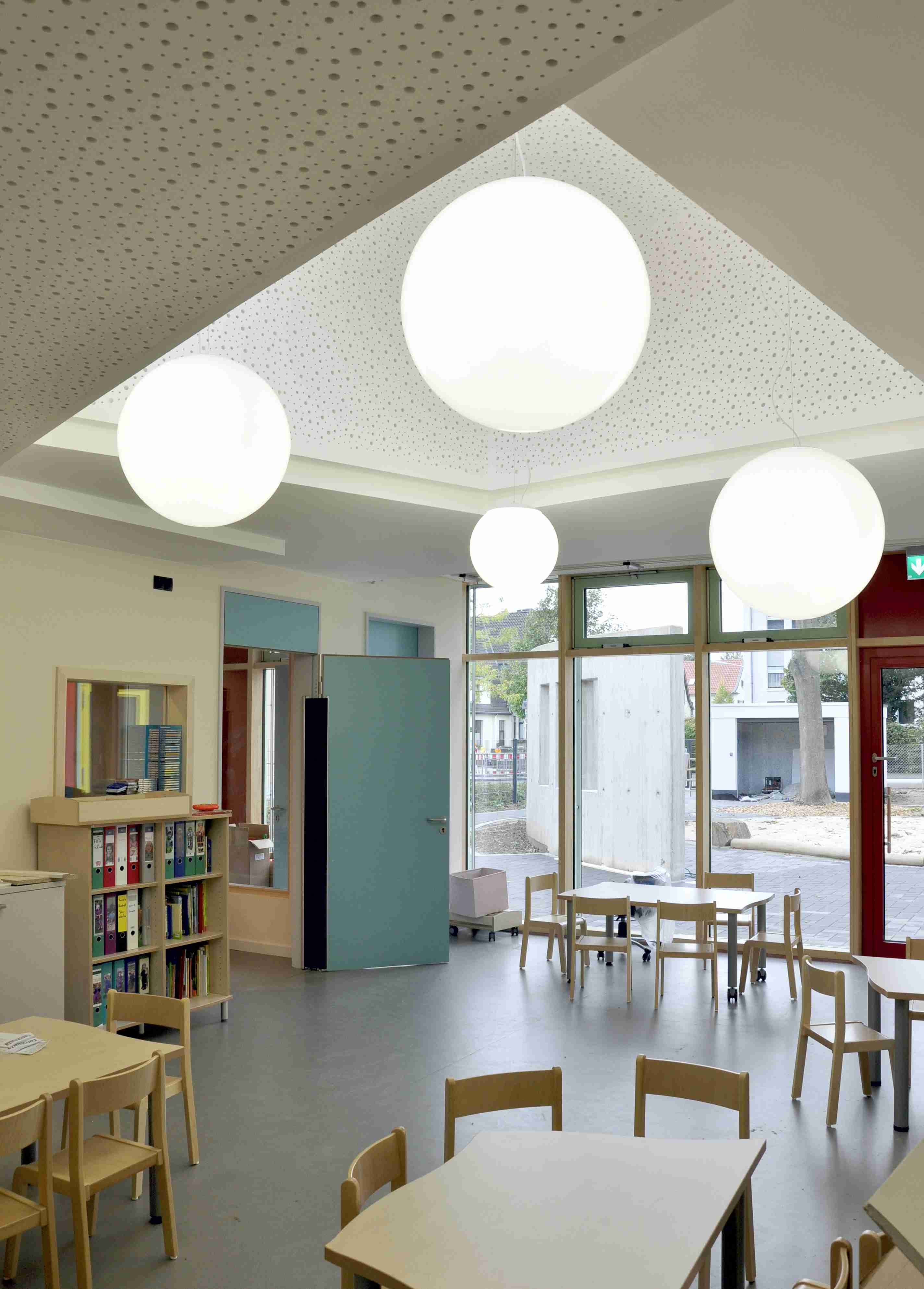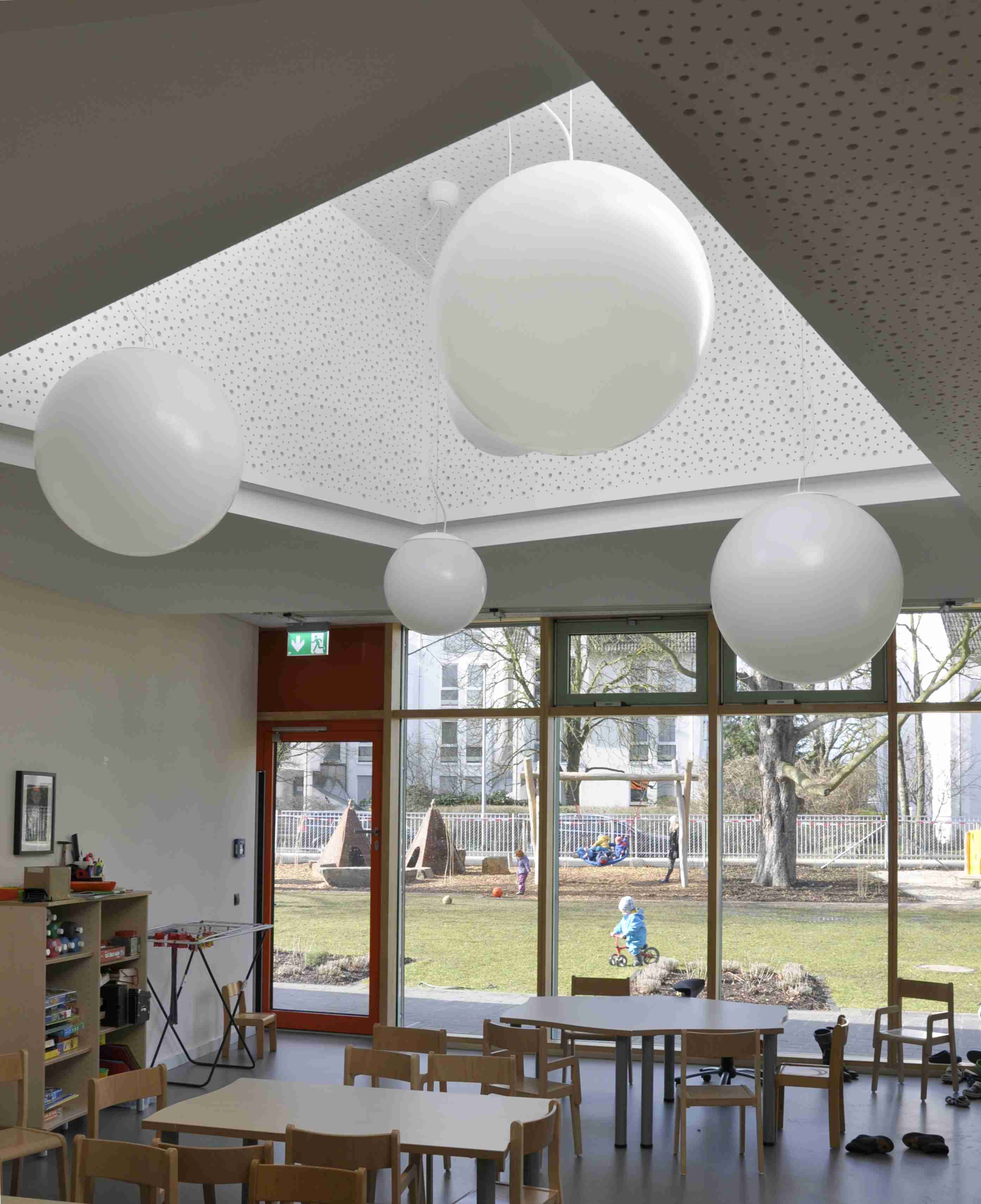Das Raumprogramm (bis zu 65 Kinder) entspricht im Wesentlichen den LVR- Empfehlungen zum Raumprogramm für Kindertagesstätten. Zusätzlich sind im Obergeschoss weitere Funktionsräume geplant: Elterngruppen, „PEKIP“,