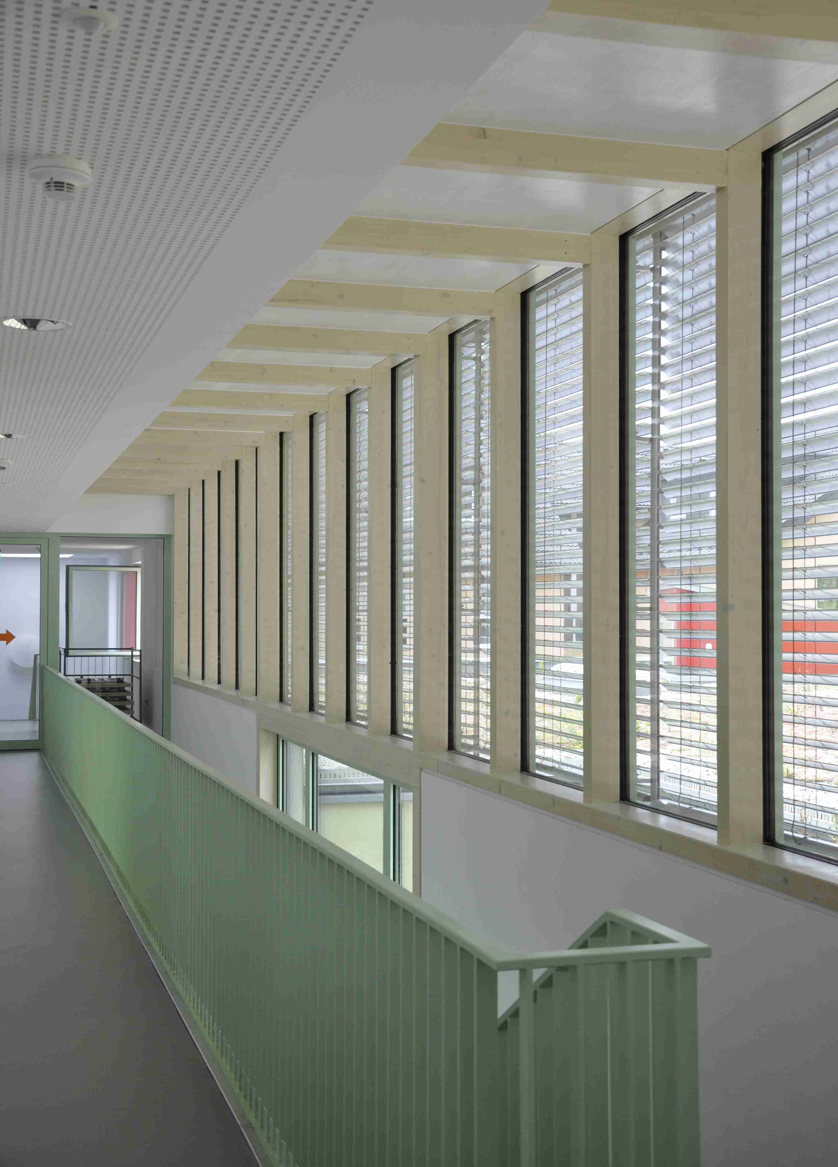 Die nach Westen gerichteten Pfosten-Riegel-Fassaden in Holz-Konstruktion erhielten Fensterelemente mit Dreifachverglasung in Alurahmen. Der Sonnenschutz ist durch außen liegende Raffstores in Aluminium gewährleistet.