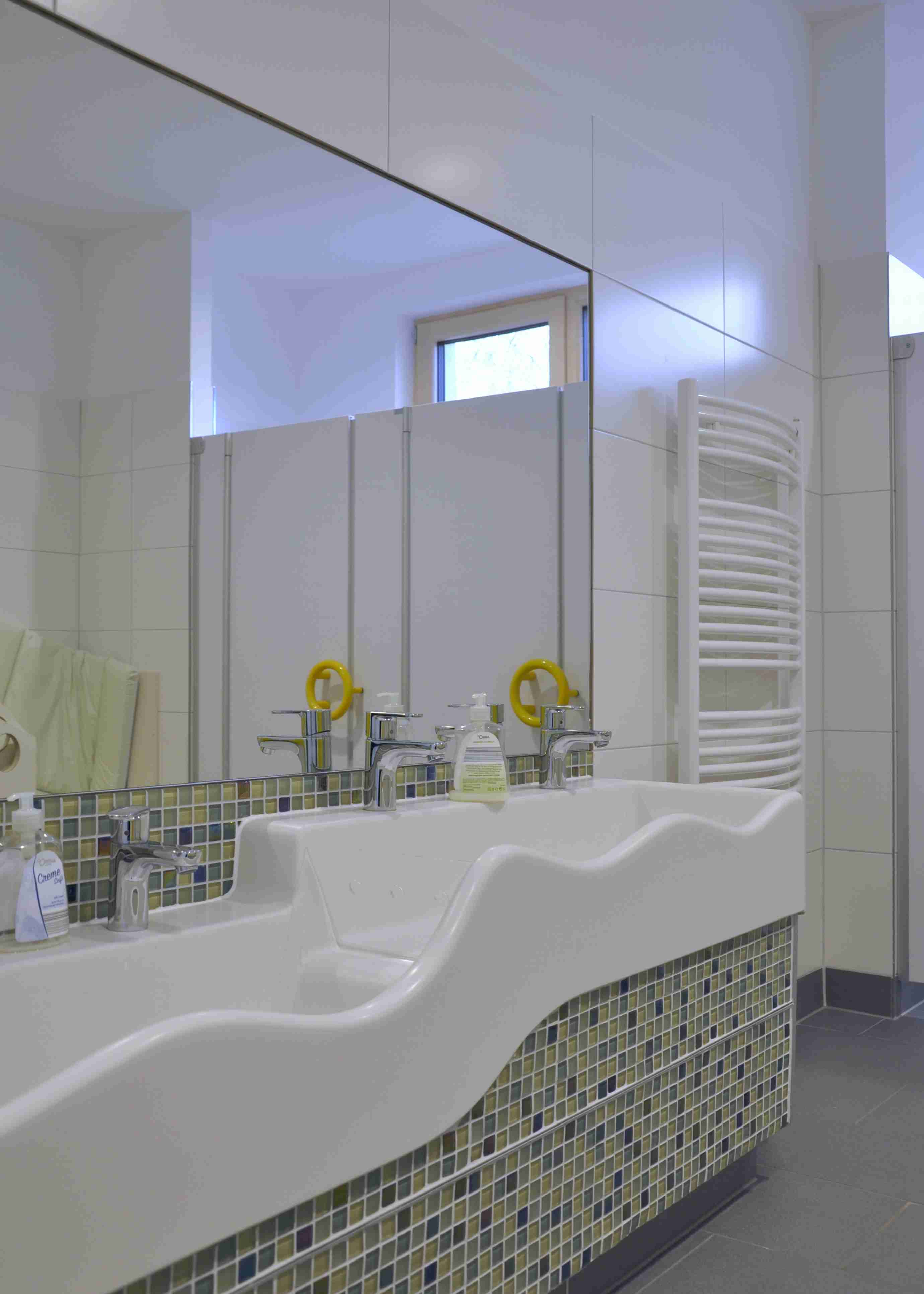 Der Zugang zu der ca. 120 m2 große Gemeinschaftsterrasse sowie der Freifläche, erfolgt direkt aus den Gruppenräumen und über „Schmutzschleusen“.