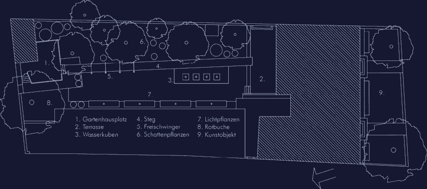 | Im Schattenbereich liegen die dunklen erhaltungswürdigen Eiben, mit Ilex und Rhododendren. Farne als Bodendecker mit punktuell eingestreuten weiß blühenden Schattenstauden bringen Weichheit mit sich. Durch Fällung von Zeder, Lärche und Fichte erhält der Garten eine sonnenbeschienende Seite und gibt den Blick frei auf die schöne Rotbuche als Point de vieuw. Hellgrüner Bambus gliedert die Sonnenseite. Farbakzente setzen kräftig blühende Stauden und Kleinsträucher. Das Wasserspiel als Spiegel von Licht und Schatten bringt Bewegung in den Garten. Eine großzügige Terrasse, Verweilplätze im Garten und am Gartenhaus lassen den Garten unterschiedlich erlebbar werden. Die Kunst (des Spielens) unterstützt diesen Gedanken. |